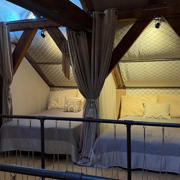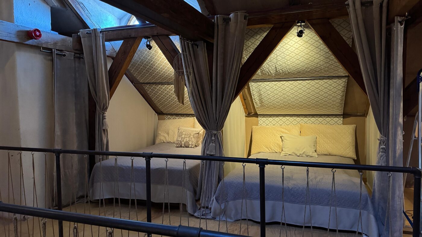 🏡 Nakšņošana muižas mansarda stāvā, kur katram dalībniekam būs sava gultas vieta ar aizkariem nodalīta privātuma zona.